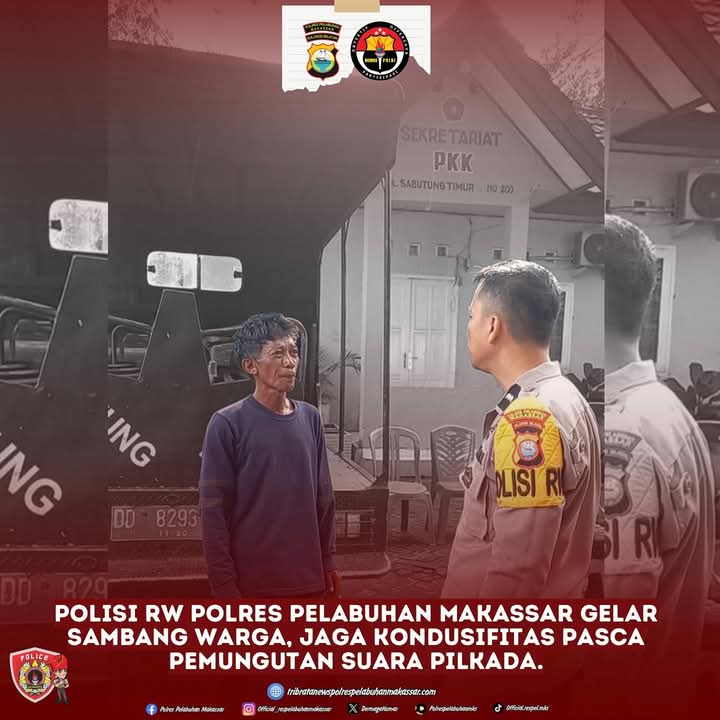 Jejakterkini.Online Dalam upaya menjaga situasi keamanan dan ketertiban masyarakat (Kamtibmas) yang aman dan kondusif pasca pemungutan suara Pilkada serentak 2024, personil Polisi RW Polres Pelabuhan Makassar melaksanakan kegiatan sambang dan tatap muka dengan warga.