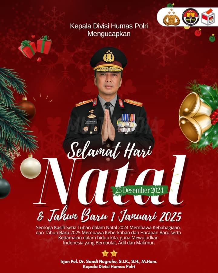 Jejakterkini.Online Kepala Divisi Humas Polri Irjen Pol. Dr. Sandi Nugroho, S.I.K., S.H., M.Hum., mengucapkan Selamat Hari Natal dan Tahun Baru 1 Januari 2025. Semoga kasih setia Tuhan dalam Natal 2024 membawa kebahagiaan dan Tahun Baru 2025 membawa keberkahan dan harapan baru serta kedamaian dalam hidup kita, guna mewujudkan Indonesia yang berdaulat, adil, dan makmur.