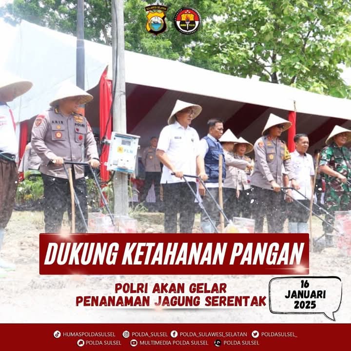 Jejakterkini.Online Polri akan menggelar penanaman jagung serentak yang akan dilaksanakan pada tanggal 16 Januari 2025, sebagai upaya Polri dalam mendukung ketahanan pangan dan swasembada pangan yang menjadi salah satu program prioritas dalam pemerintahan Presiden Prabowo Subianto.