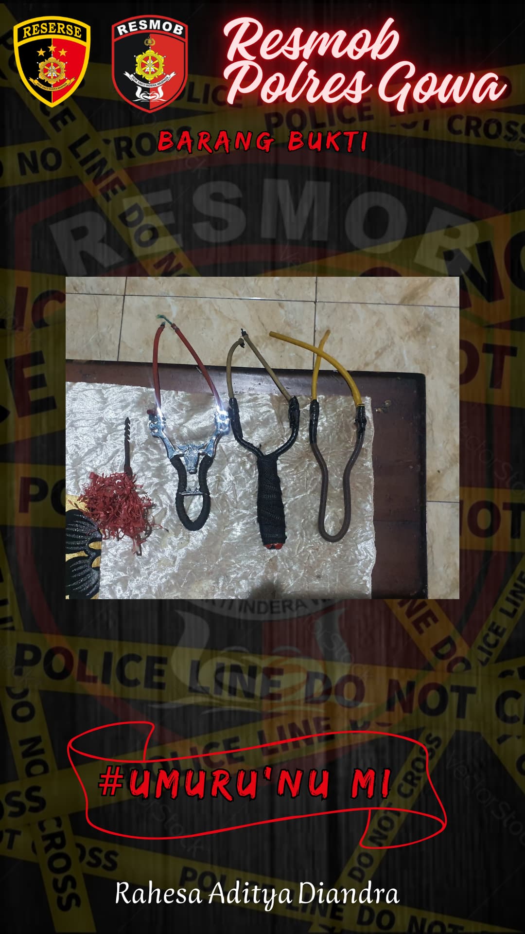 Dari tangan pelaku, petugas berhasil menyita sejumlah barang bukti berupa 13 buah ketapel dan 1 buah anak panah (mata busur) yang diduga digunakan dalam aksi kejahatan.