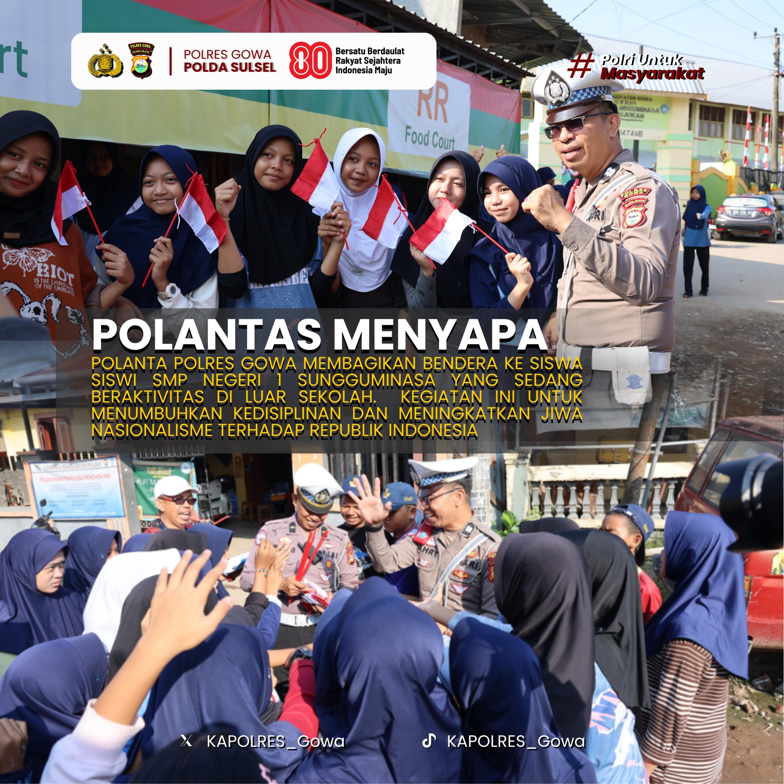 Jejakterkini.online — Dalam rangka menyambut Hari Ulang Tahun ke-80 Republik Indonesia, Satlantas Polres Gowa melalui program “Polantas Menyapa” melaksanakan kegiatan pembagian bendera merah putih kepada siswa-siswi SMP Negeri 1 Sungguminasa yang sedang beraktivitas di luar sekolah, Kamis (7/8/2025).