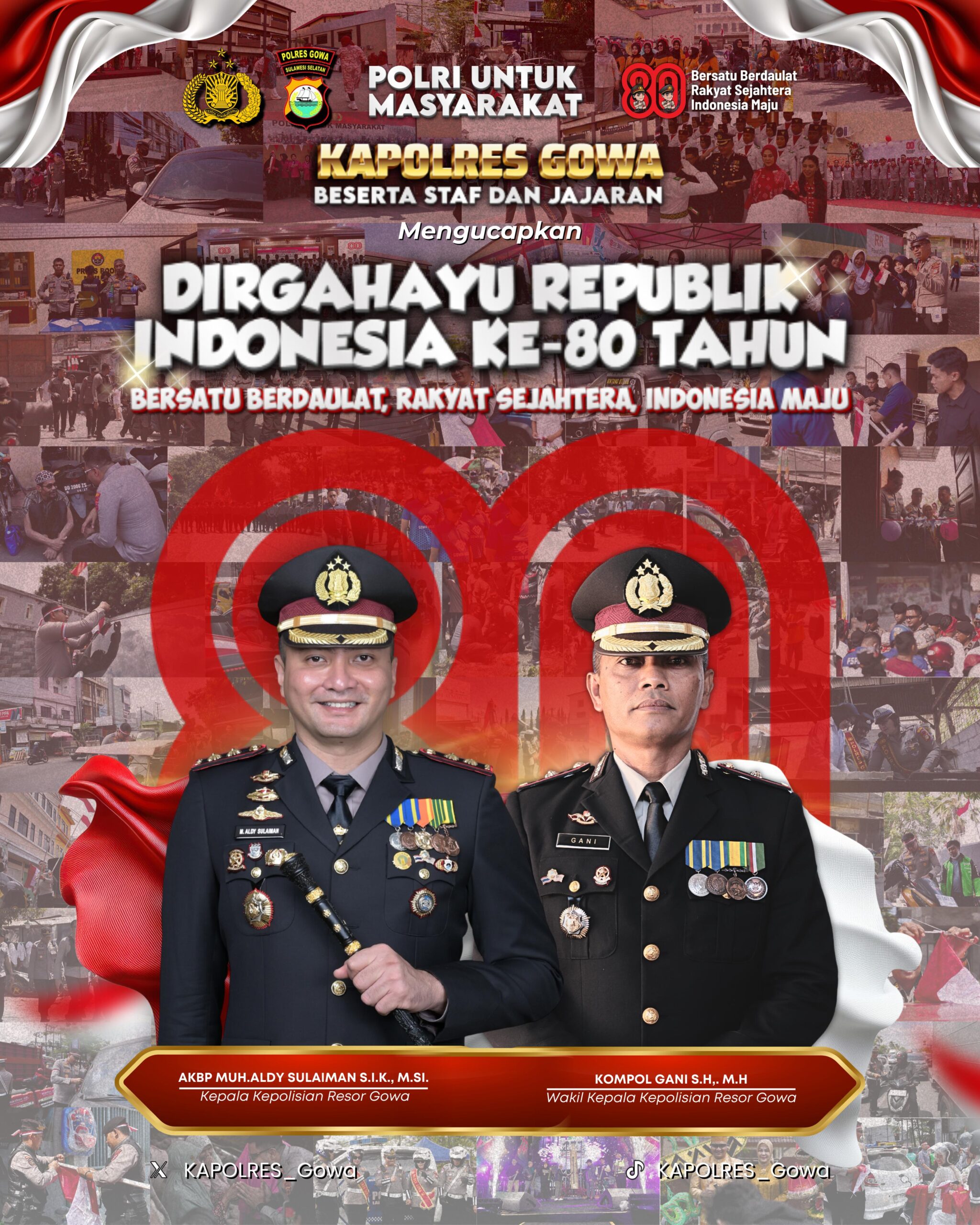 Jejakterkini.Online Kapolres Gowa AKBP Muhammad Aldy Sulaiman, S.I.K., M.Si, bersama seluruh staf dan jajaran Polres Gowa, mengucapkan Dirgahayu Republik Indonesia ke-80 Tahun, Minggu (17/8/2025).