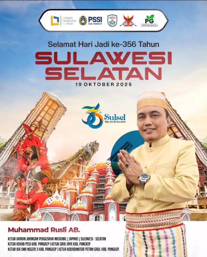 Jejakterkini.Online Pangkep — Dalam semangat memperingati Hari Jadi ke-356 Provinsi Sulawesi Selatan yang jatuh pada 19 Oktober 2025, Ketua Harian Jaringan Pengusaha Nasional (JAPNAS) pada saat di konfirmasi minggu (19.10.2025)