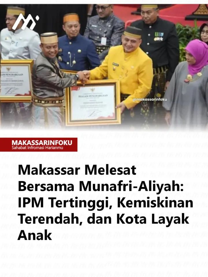 Tiga penghargaan yang diraih Kota Makassar meliputi kategori Kota Layak Anak Terbaik dengan predikat Nindya, Kota dengan persentase penduduk miskin terendah dengan capaian 4,97 persen, serta Kota dengan Indeks Pembangunan Manusia (IPM) tertinggi, yakni 83,92 poin.