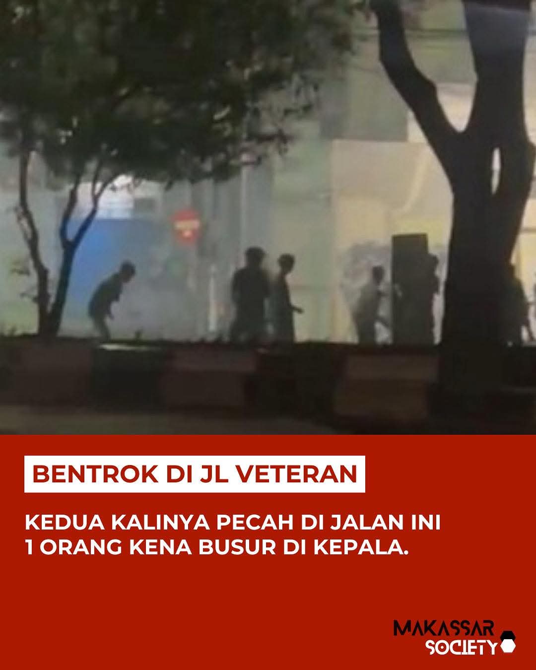Bentrok antarkelompok warga dua kali pecah di Jalan Veteran, Kota Makassar, Sulawesi Selatan (Sulsel), dalam semalam. Satu orang dilaporkan terkena busur panah di bagian kepala.