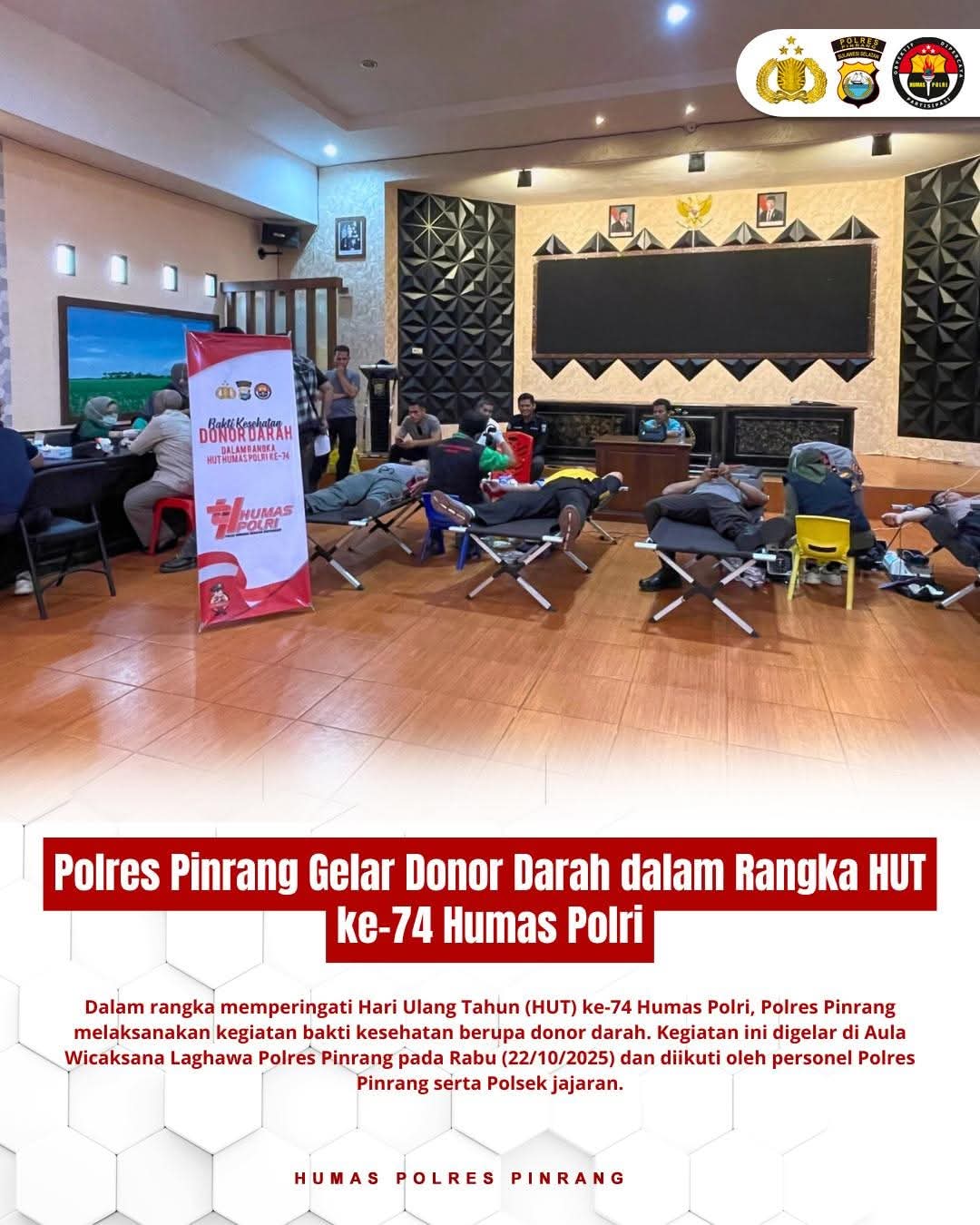 Jejakterkini.online — ‎‎Dalam rangka memperingati Hari Ulang Tahun (HUT) ke-74 Humas Polri, Polres Pinrang melaksanakan kegiatan bakti kesehatan berupa donor darah. Kegiatan ini digelar di Aula Wicaksana Laghawa Polres Pinrang pada Rabu (22/10/2025) dan diikuti oleh personel Polres Pinrang serta Polsek jajaran.