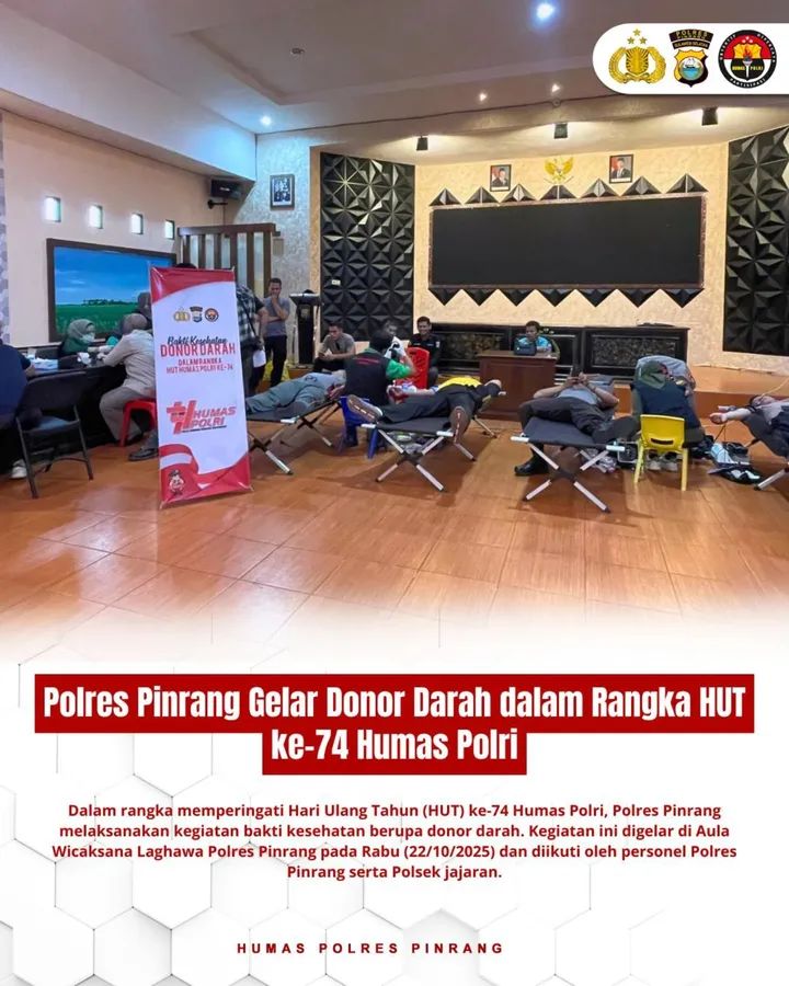 Jejakterkini.online — ‎‎Dalam rangka memperingati Hari Ulang Tahun (HUT) ke-74 Humas Polri, Polres Pinrang melaksanakan kegiatan bakti kesehatan berupa donor darah. Kegiatan ini digelar di Aula Wicaksana Laghawa Polres Pinrang pada Rabu (22/10/2025) dan diikuti oleh personel Polres Pinrang serta Polsek jajaran.