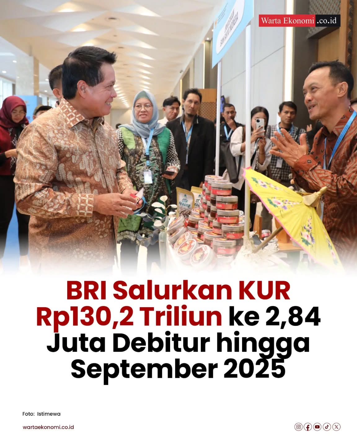 Direktur Utama BRI Hery Gunardi menegaskan bahwa KUR bukan sekadar instrumen pembiayaan, melainkan katalis yang mampu menggerakkan ekonomi rakyat. Hingga akhir September 2025, sekitar 18 dari setiap 100 rumah tangga telah mengakses fasilitas KUR BRI, meningkat dari tahun-tahun sebelumnya. Secara kumulatif sejak 2015, BRI telah menyalurkan KUR Rp1.387 triliun kepada 45,5 juta penerima. BRI menegaskan komitmennya untuk terus menjadi mitra utama UMKM Indonesia dalam mendorong pertumbuhan ekonomi inklusif dan berkelanjutan.