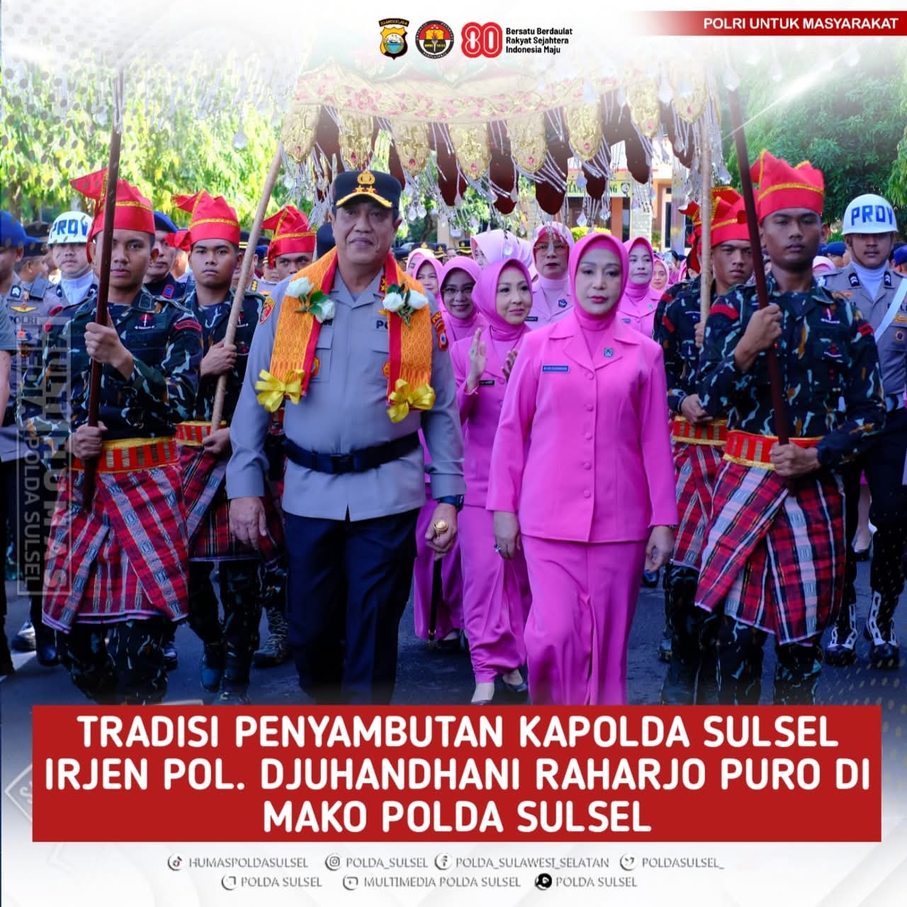 Dalam tradisi penyambutan tersebut, Irjen Pol. Djuhandani Raharjo Puro menerima upacara kehormatan yang diawali dengan tradisi angngaru yaitu sumpah setia khas budaya Bugis-Makassar yang dibawakan oleh personel Brimob Polda Sulsel serta jajar kehormatan. Tradisi ini menjadi simbol penghormatan dan kesetiaan terhadap pimpinan yang baru.
