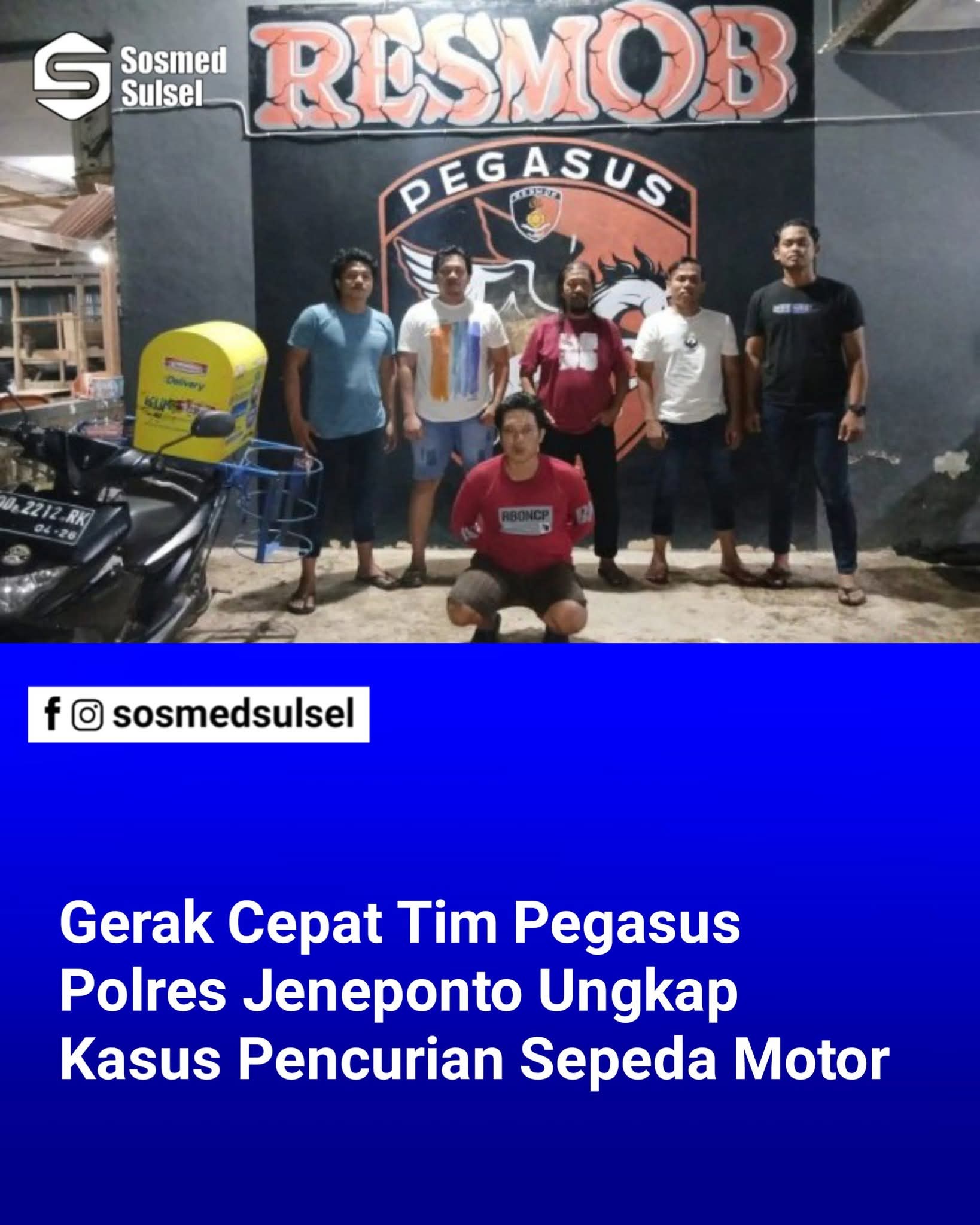 Jejakterkini.online — Tim Pegasus Resmob Sat Reskrim Polres Jeneponto yang dipimpin oleh Aiptu Abd. Rasyad melakukan pengungkapan dan penangkapan terduga pelaku tindak pidana pencurian sepeda motor (curanmor) pada Jumat (07/11/2025) sekitar pukul 02.30 Wita di Lingkungan Ci’nong, Kel. Tonrokassi, Kec. Tamalatea, Kab. Jeneponto.