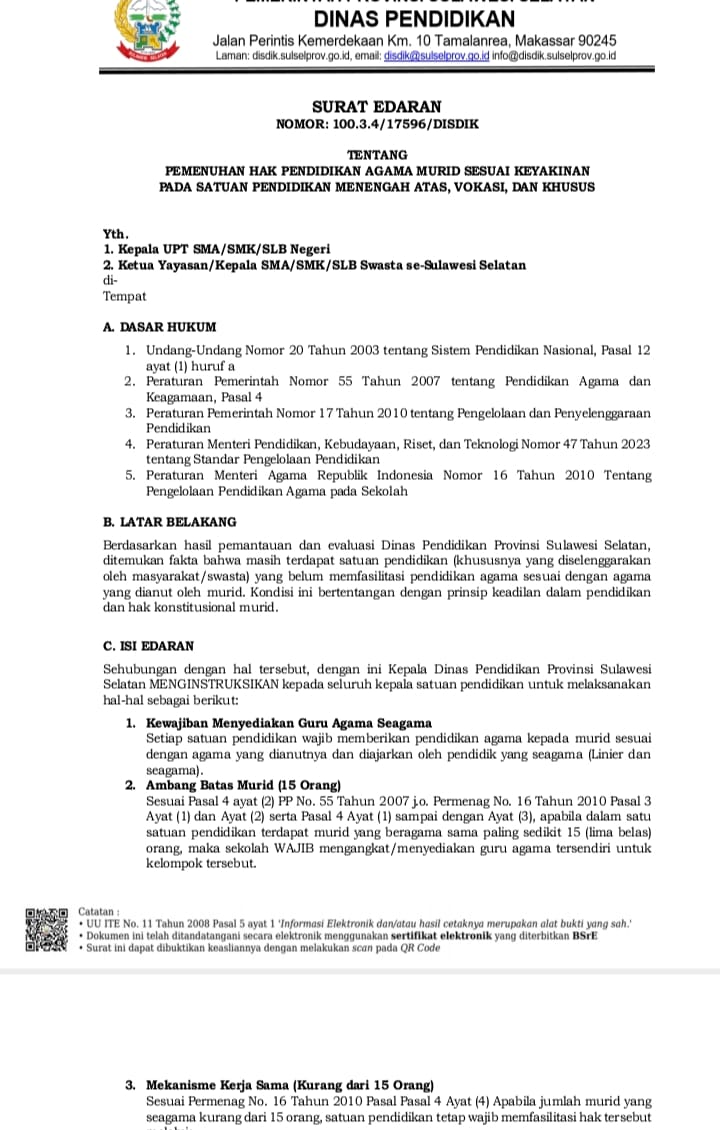 Dinas Pendidikan Sulawesi Selatan mengimbau seluruh sekolah untuk segera menindaklanjuti edaran ini demi menjamin hak pendidikan agama setiap peserta didik secara adil dan sesuai ketentuan perundang-undangan.