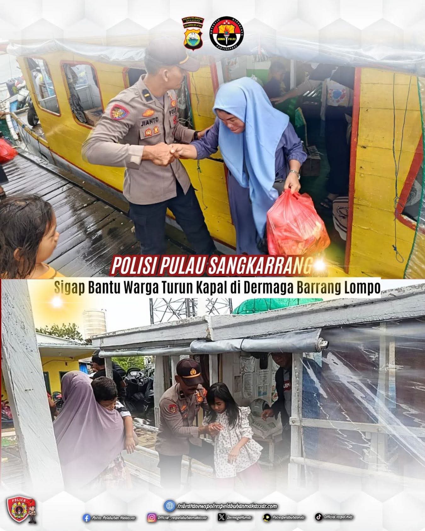 Jejakterkini.online — Personel Polsubsektor Kepulauan Sangkarrang, Polres Pelabuhan Makassar, turun langsung membantu warga yang hendak turun dari kapal di Dermaga Penyeberangan Pulau Barrang Lompo, Kecamatan Kepulauan Sangkarrang.
