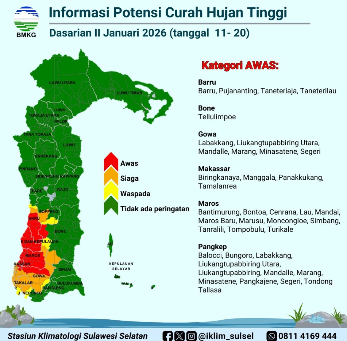 “Berdasarkan informasi BMKG, wilayah Kabupaten Maros berpotensi mengalami curah hujan dengan intensitas sedang hingga tinggi mulai tanggal 11 sampai 20 Januari. Untuk itu, kami mengimbau masyarakat agar tetap waspada dan berhati-hati dalam beraktivitas, terutama di daerah yang rawan banjir dan longsor,” ujar AKP Ahmad, Sabtu (10/1/2025).