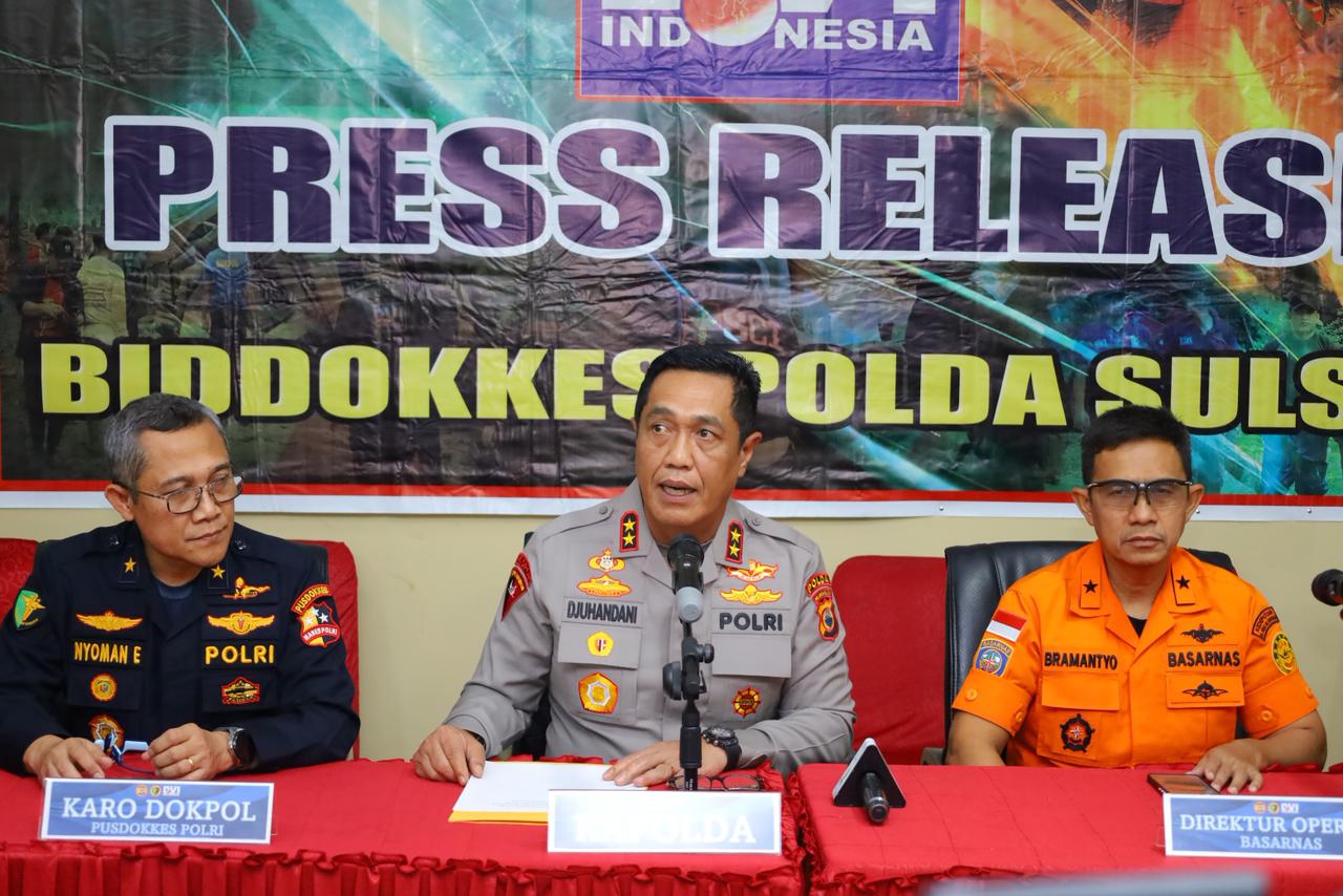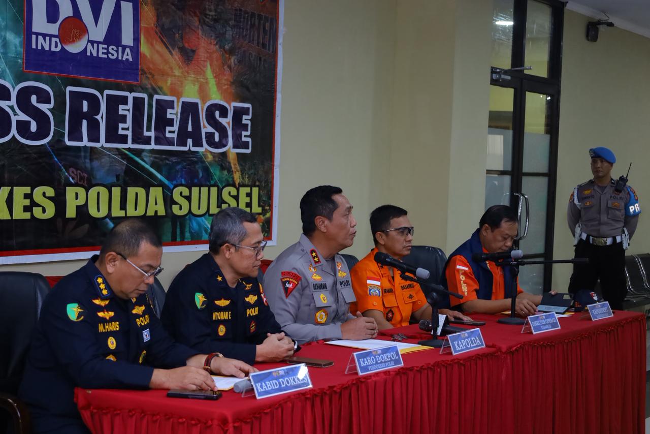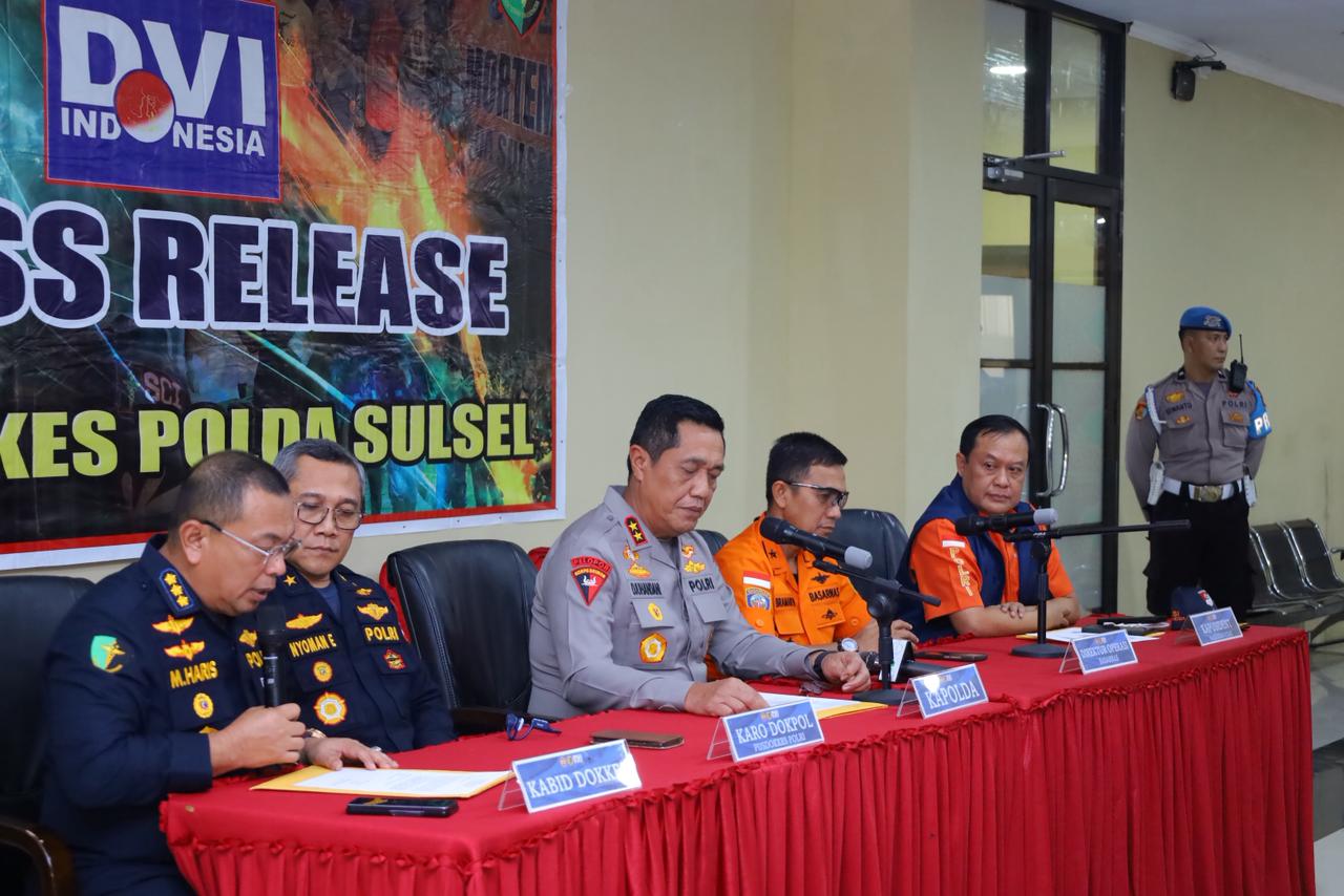 Konferensi pers dipimpin langsung oleh Kapolda Sulawesi Selatan Irjen Pol. Djuhandhani Rahardjo Puro, S.H., M.H., didampingi Karo Dokpol Pusdokkes Polri Brigjen Pol. dr. A. Nyoman Eddy Purnama Wirawan, DFM., Sp.F, Direktur Operasi Basarnas Laksamana Pertama TNI Yudhi Bramantyo, N.S., M.TR., Opsla, serta Kapusident Bareskrim Polri Brigjen Pol. Mashudi, S.I.K., S.H., M.Hum., Kabiddokkes Polda Sulsel Kombes Pol. dr. Muhammad Haris, M.A.R.S., QHIA.