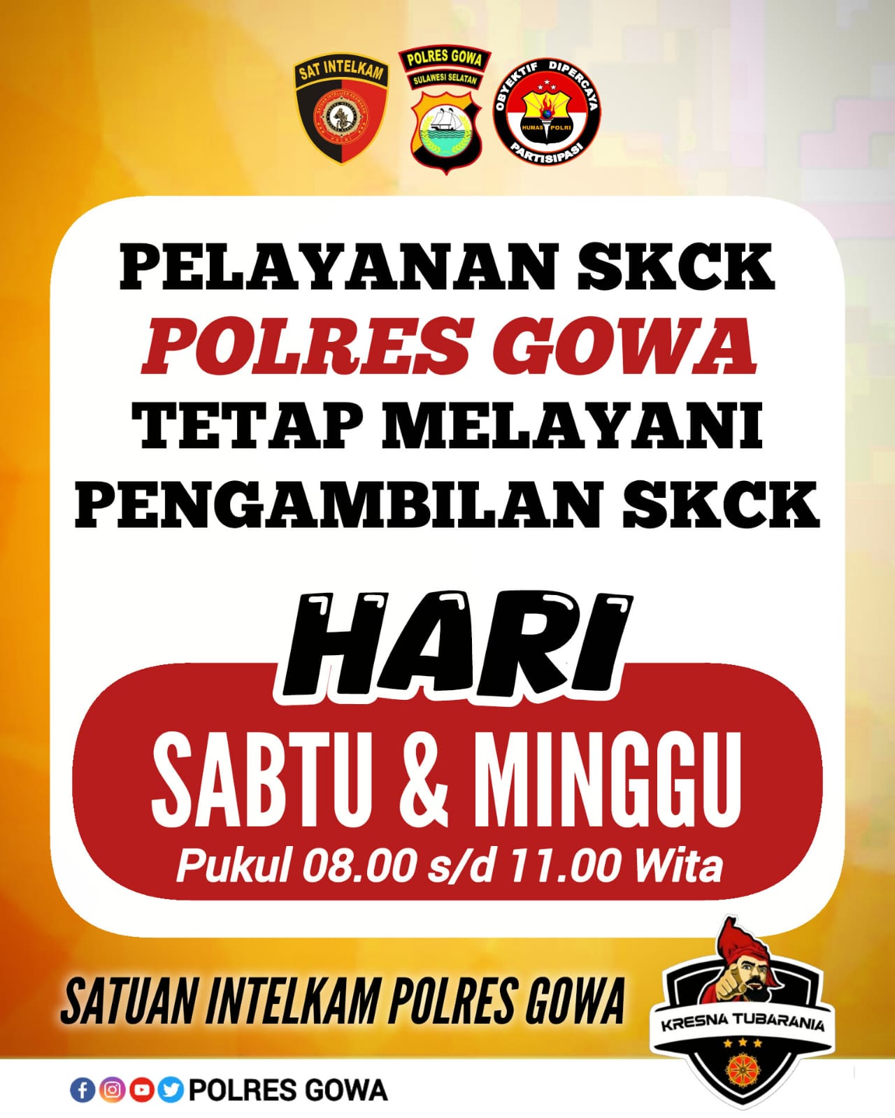 Pelayanan pengambilan SKCK di hari Sabtu dan Minggu ini dilaksanakan oleh Satuan Intelkam Polres Gowa dengan tetap mengedepankan profesionalisme, ketertiban, serta kenyamanan pemohon.