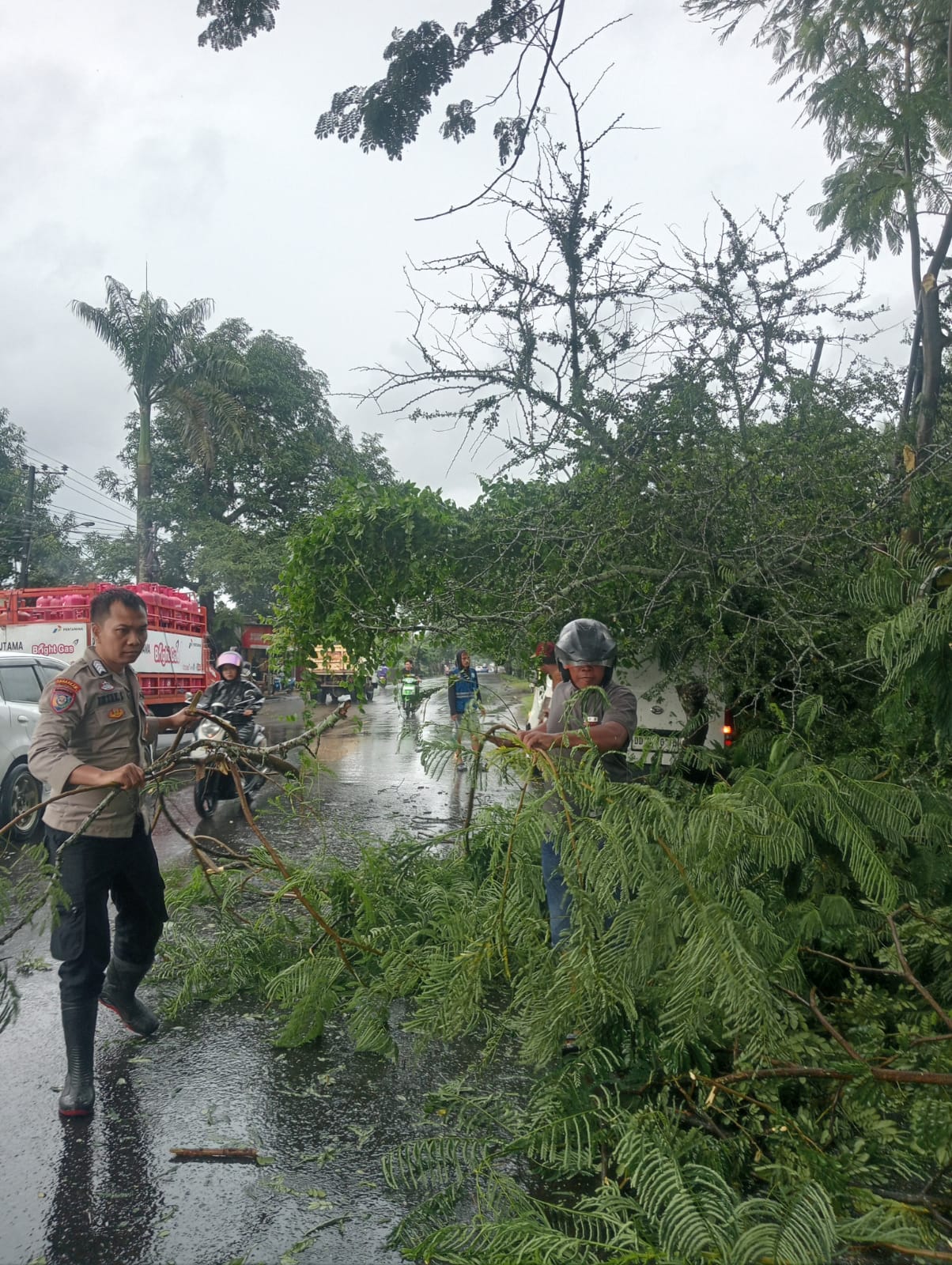 Kejadian tersebut diduga akibat tingginya curah hujan yang mengguyur wilayah tersebut, sehingga menyebabkan pohon tumbang dan menghambat arus lalu lintas serta membahayakan pengguna jalan.