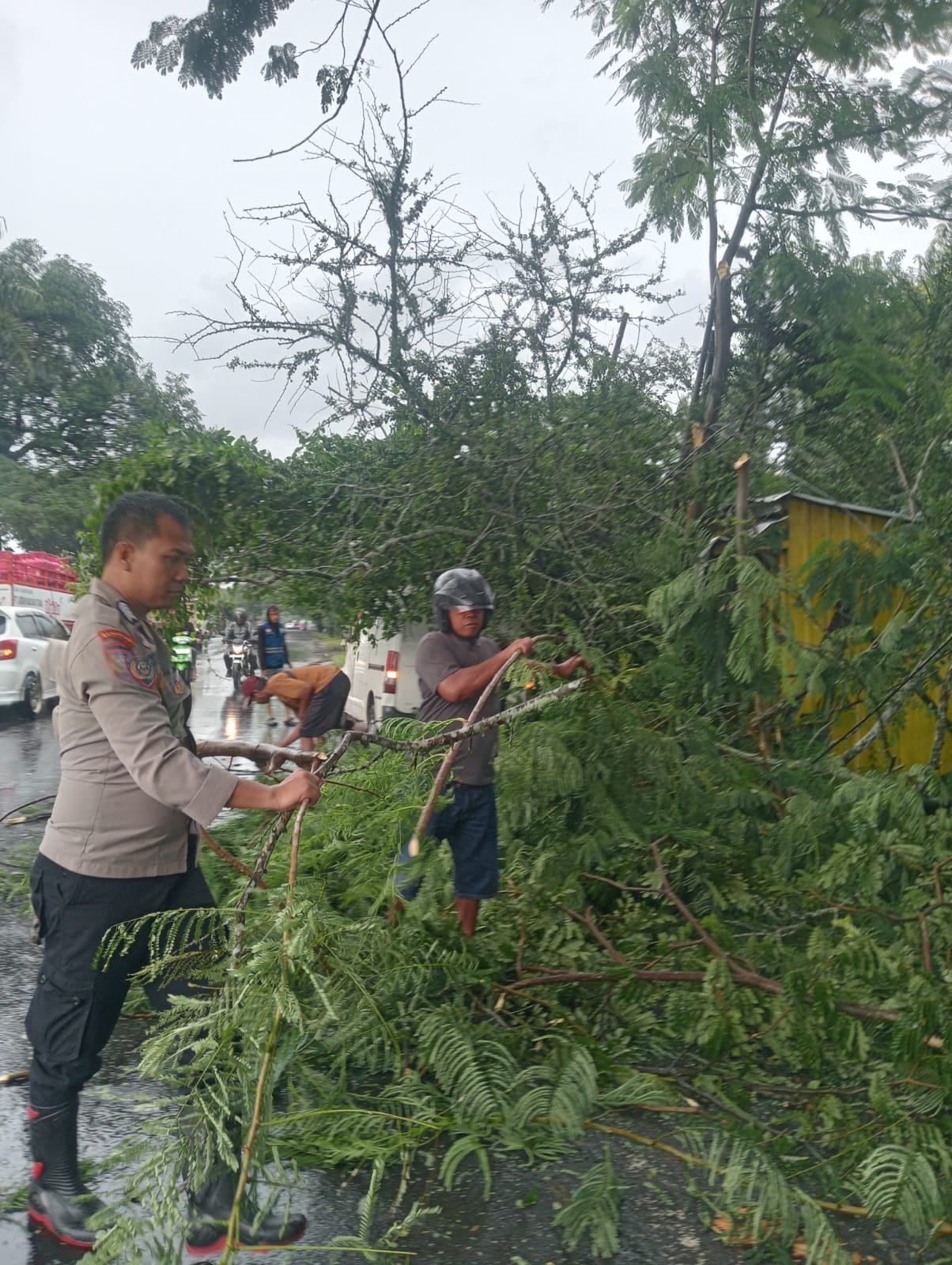 Setibanya di lokasi, BRIPKA Ihzan Sardillah langsung melakukan pengamanan lokasi, membantu evakuasi kendaraan yang tertimpa pohon, serta bersama warga melakukan pemangkasan dan pemotongan pohon yang menutupi sebagian badan jalan agar arus lalu lintas dapat kembali normal.