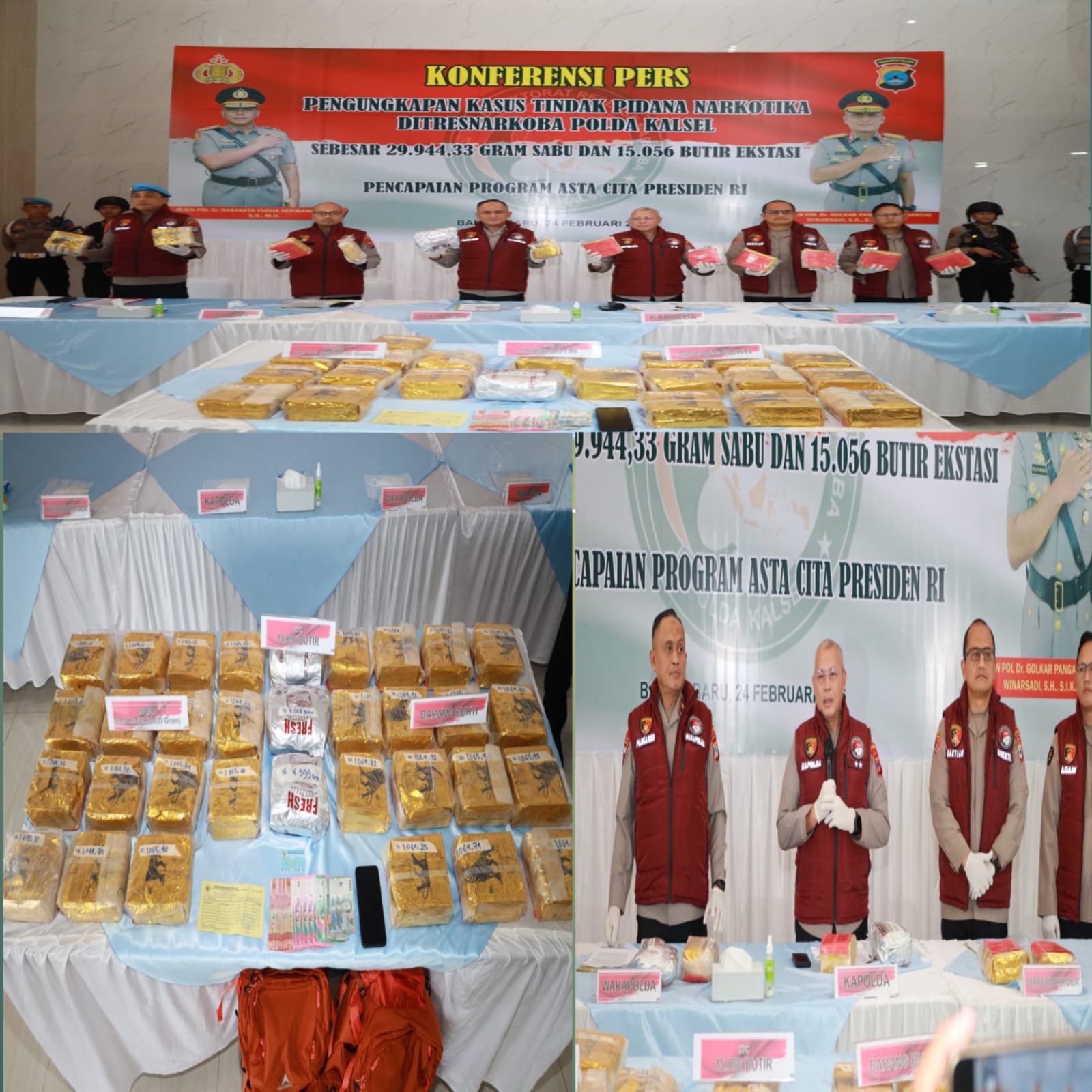 Jejakterkini.Online Direktorat Reserse Narkoba (Ditresnarkoba) Polda Kalimantan Selatan menggelar konferensi pers pada Selasa (24/2/2026) siang terkait pengungkapan kasus besar peredaran gelap narkotika. Dari tangan seorang kurir, polisi berhasil menyita barang bukti sabu seberat 29.944,33 gram (29,9 Kg) dan 15.056 butir pil ekstasi dengan berat bersih 5.767,47 gram.