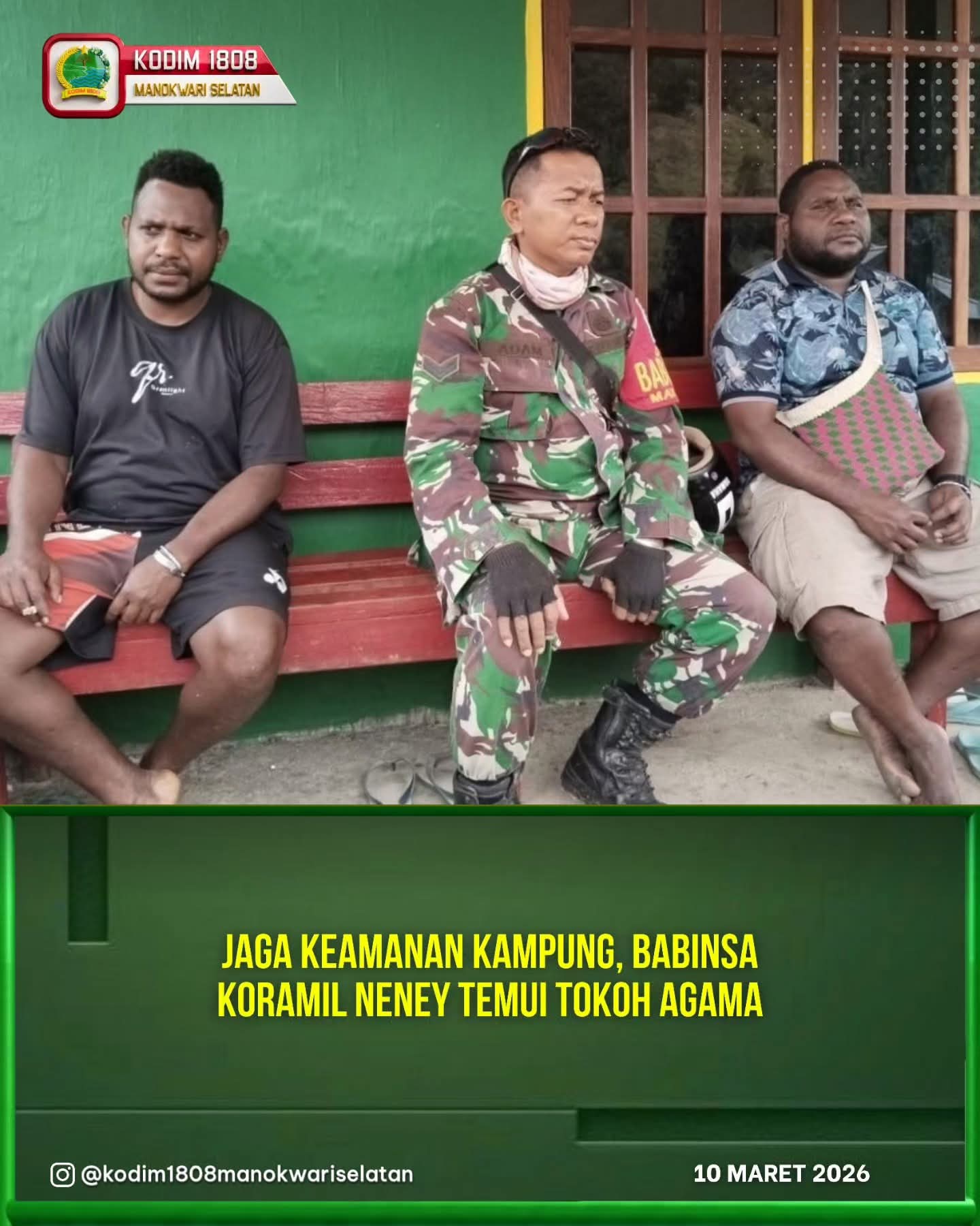 jejakterkini.online – Dalam rangka menjaga situasi keamanan dan ketertiban masyarakat Babibinsa Koramil 1808-06/Neney, Sertu Adam, melaksanakan kegiatan Komunikasi Sosial bersama tokoh agama di Kampung Aryawenmoho, Distrik Neney, Kabupaten Manokwari Selatan, Selasa (10/3/2026).
