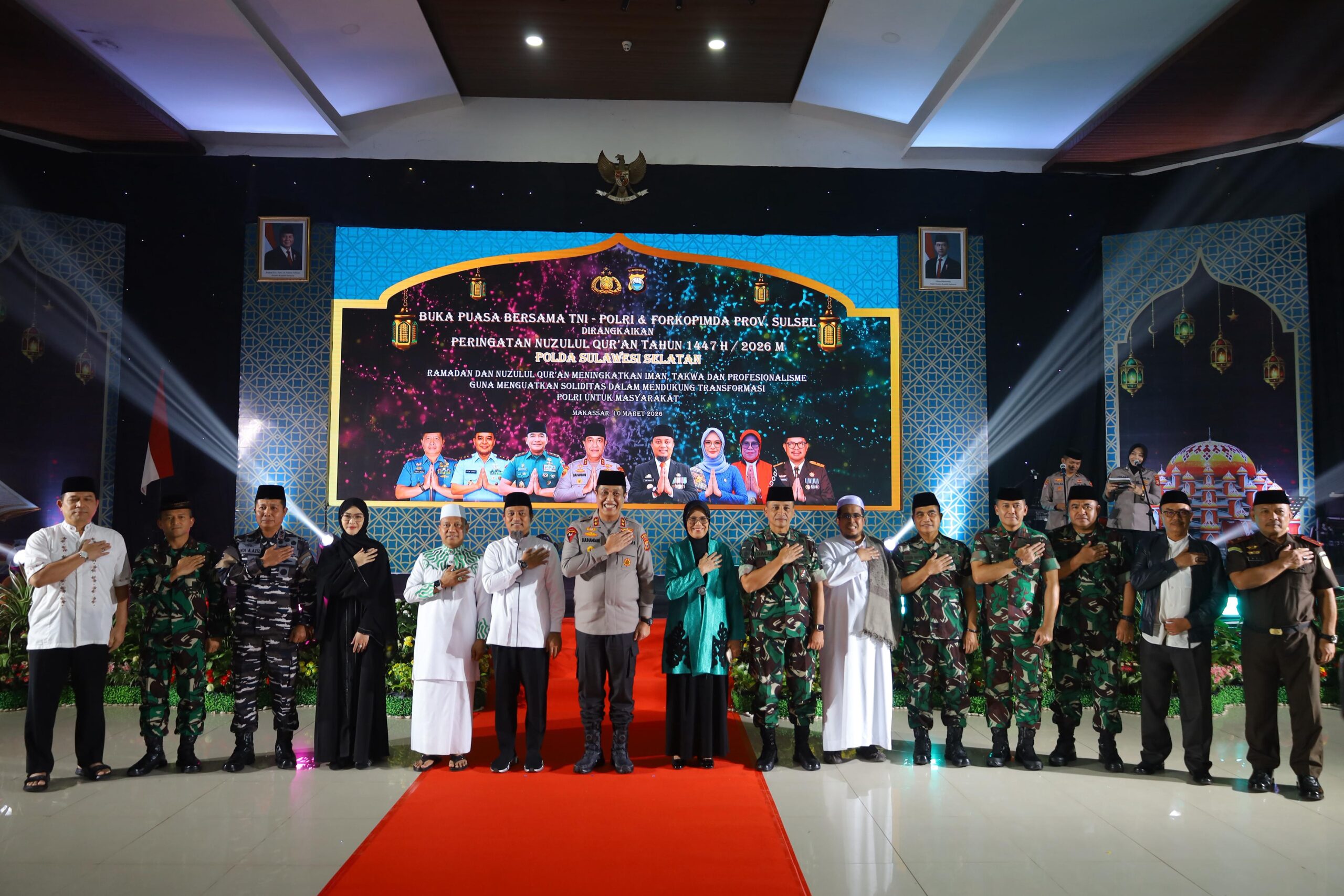 jejakterkini.online – Kepolisian Daerah Sulawesi Selatan (Polda Sulsel) menggelar kegiatan buka puasa bersama TNI-Polri dan Forum Koordinasi Pimpinan Daerah (Forkopimda) Sulawesi Selatan yang dirangkaikan dengan peringatan Nuzulul Qur’an 1447 H/2026 M. Kegiatan tersebut berlangsung di Aula Mappaoddang Mapolda Sulsel, Selasa (10/03/2026).