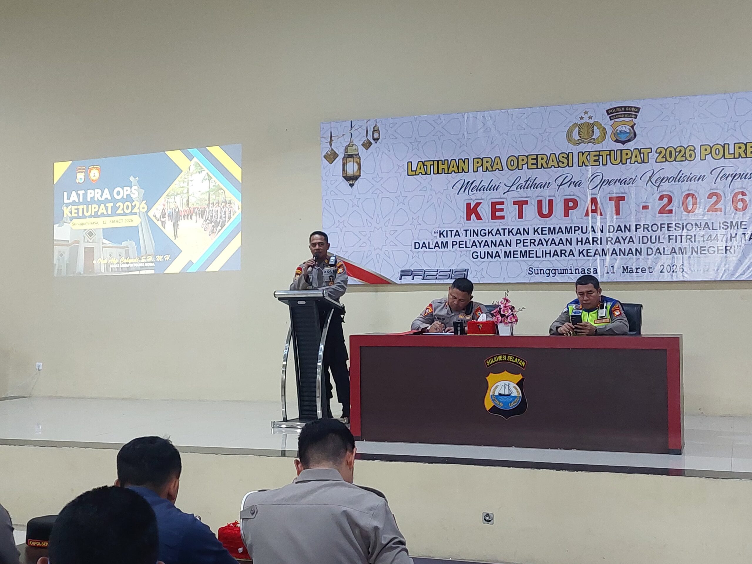 jejakterkini.online – Dalam rangka meningkatkan kesiapan personel dalam menghadapi pengamanan Hari Raya Idul Fitri 1447 H, Polres Gowa menggelar Latihan Pra Operasi (Latpraops) Kepolisian Terpusat Ketupat 2026 yang berlangsung di Aula Rewako Polres Gowa, Kamis (12/3/2026).