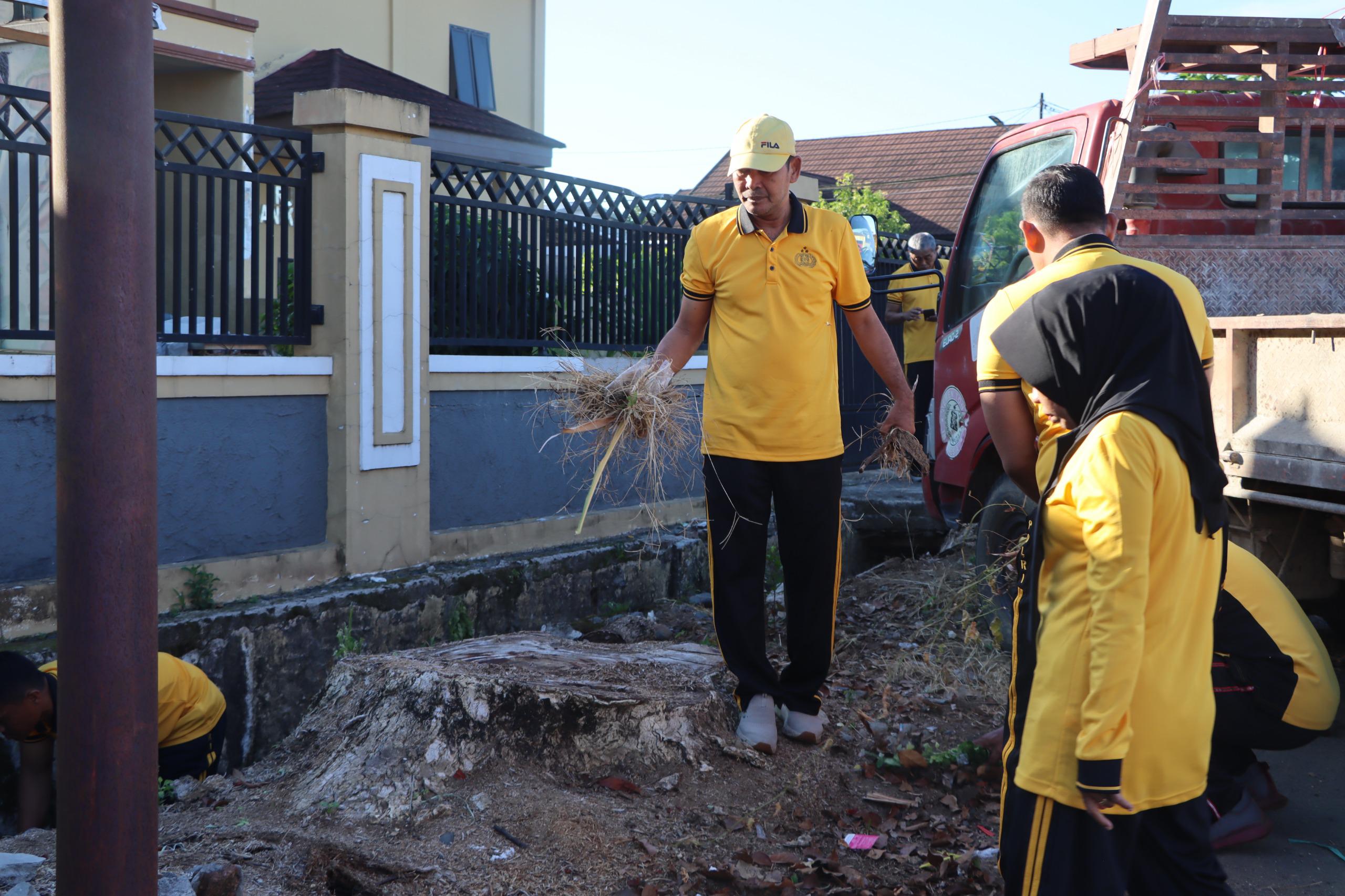 Personel tampak kompak membersihkan halaman, merapikan taman, serta mengumpulkan sampah di area sekitar mako guna menciptakan lingkungan yang bersih dan nyaman.