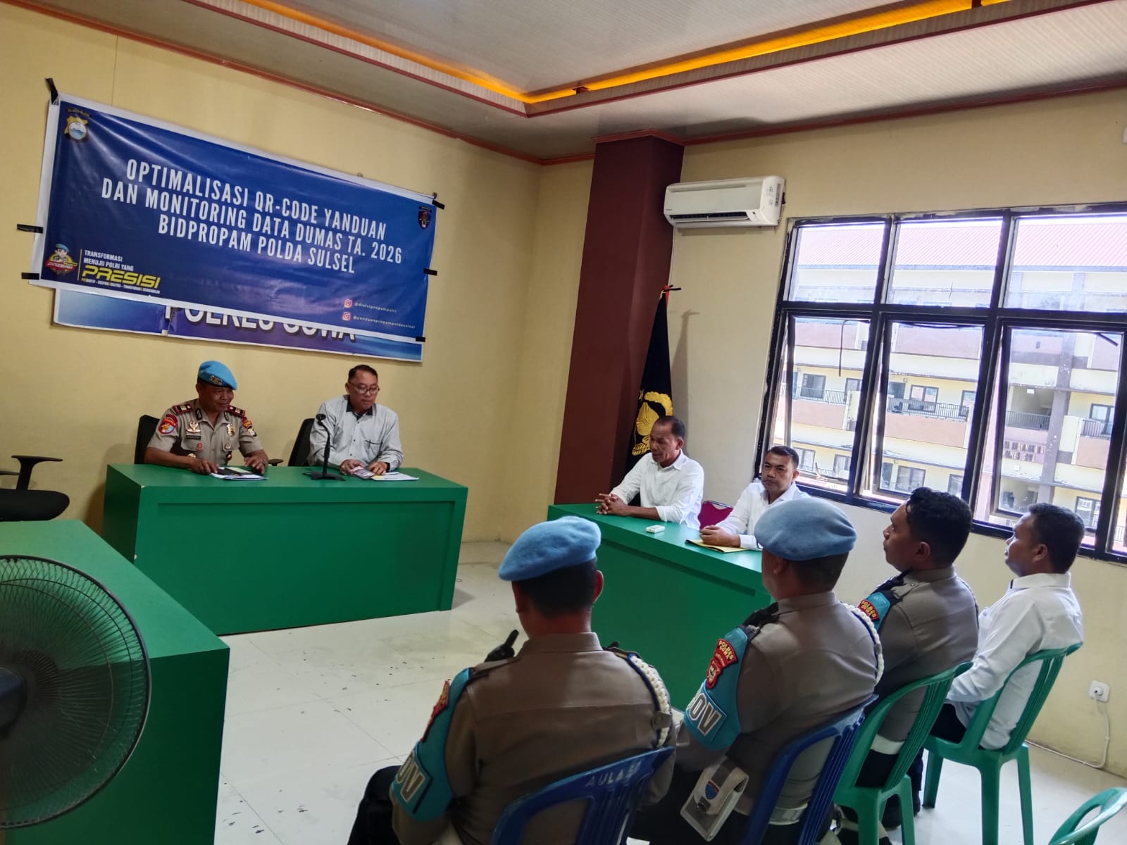 jejakterkini.online – Dalam rangka meningkatkan pelayanan pengaduan masyarakat yang transparan dan akuntabel, tim dari Bidpropam Polda Sulsel melaksanakan kegiatan Sosialisasi Optimalisasi QR Code Yanduan serta Monitoring Data Dumas Tahun Anggaran 2026 di Polres Gowa, Senin (20/4/2026).